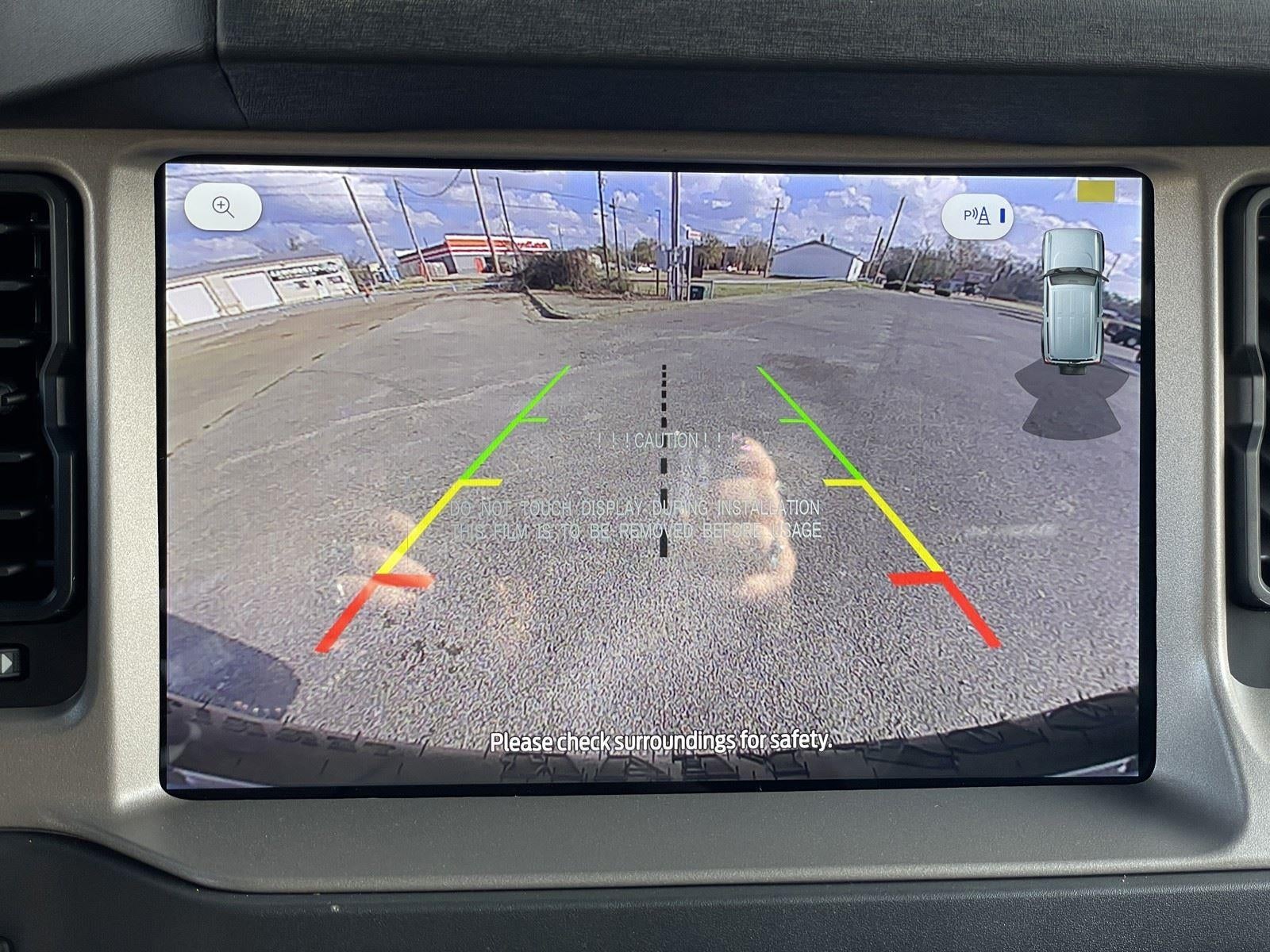- The vehicle is equipped with a camera that displays an image of the area behind the vehicle on an interior display.