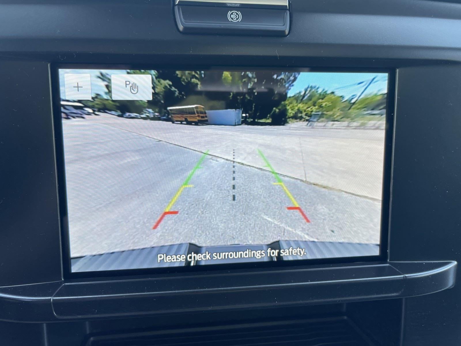 - The vehicle is equipped with a camera that displays an image of the area behind the vehicle on an interior display.