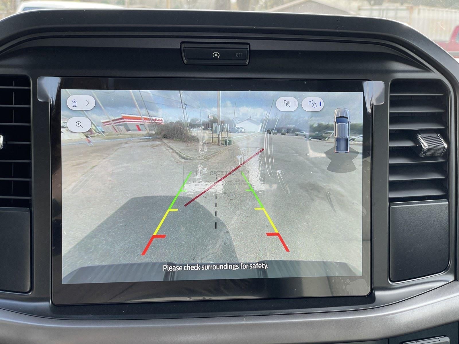 - The vehicle is equipped with a camera that displays an image of the area behind the vehicle on an interior display.