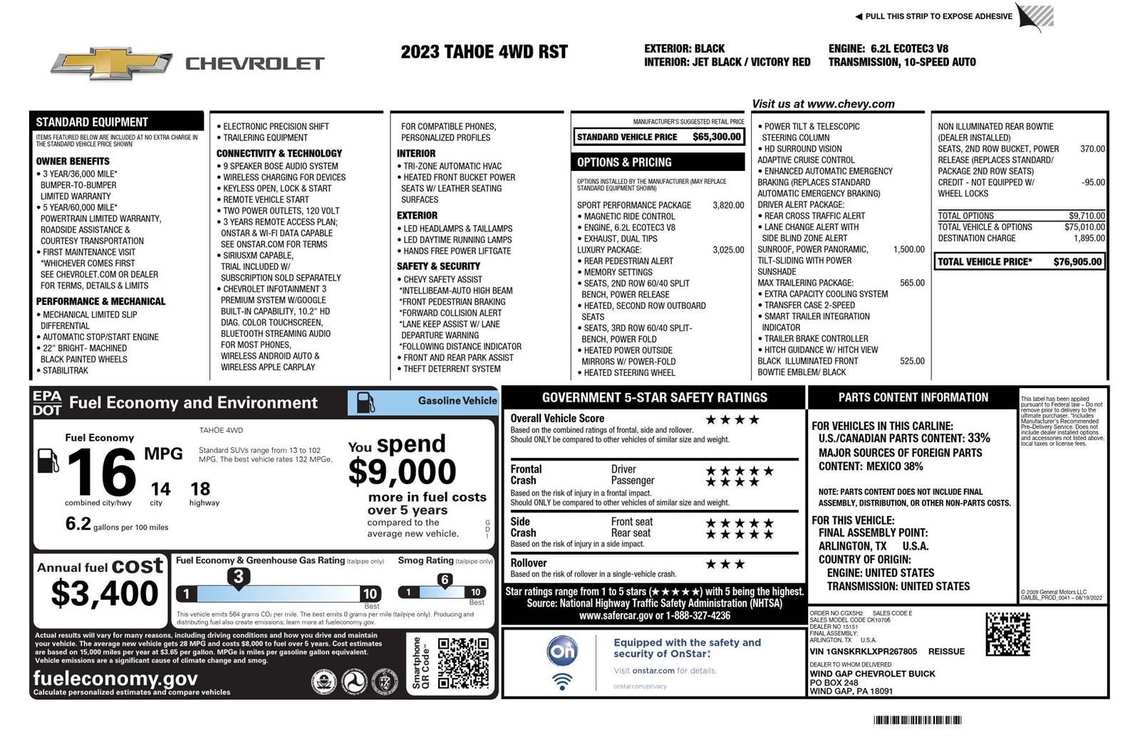 Clean Carfax! One Owner!**WARRANTY REMAINING: 0 MONTHS OR 2,081 MILES****SPORT PERFORMANCE PACKAGE** ($3,820 ADD TO MSRP), **LUXURY PACKAGE** ($3,025 ADD TO MSRP), **SUNROOF, POWER PANORAMIC, TILT-SLIDING WITH POWER SUNSHADE** ($1,500 ADD TO MSRP), MAX TRAILERING PACKAGE, BLACK ILLUMINATED FRONT BOWTIE EMBLEM/ BLACK, SEATS, 2ND ROW BUCKET, POWER RELEASE, 6.2L V8, 10-SPEED AUTO TRANSMISSION, 4WD, 22'' WHEELS, KEYLESS ENTRY, PUSH BUTTON START, REMOTE START, POWER SUNROOF, HEATED STEERING WHEEL, HEATED FRONT SEATS, POWER DRIVER SEAT WITH MEMORY, 10.2'' IN SCREEN DISPLAY, CHEVROLET INFOTAINMENT 3 PREMIUM SYSTEM W/GOOGLE BUILT-IN CAPABILITY, APPLE CARPLAY, ANDROID AUTO, Bluetooth® FOR HANDS-FREE PHONE, BOSE AUDIO SYSTEM, WIRELESS CHARGING PAD, ADAPTIVE CRUISE CONTROL, LEATHER SEATS, BUCKET SEATS, STABILITRAK, TRAILERING EQUIPMENT, CHEVY SAFETY ASSIST, FRONT PEDESTRIAN BRAKING, FORWARD COLLISION ALERT, LANE KEEP ASSIST W/ LANE DEPARTURE WARNING, THEFT DETERRENT SYSTEM, ENHANCED AUTOMATIC EMERGENCY BRAKING, REAR CROSS TRAFFIC ALERT, LANE CHANGE ALERT WITH SIDE BLIND ZONE ALERT, TRAILER BRAKE CONTROLLER, HITCH GUIDANCE W/ HITCH VIEW